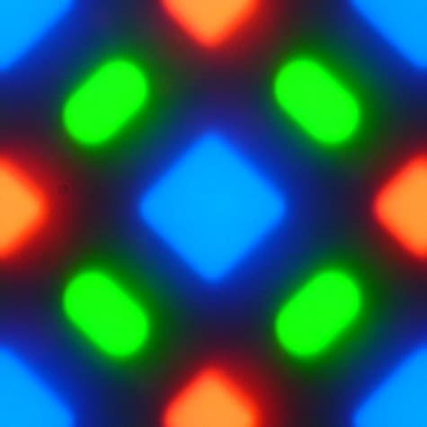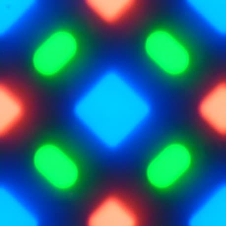 В этом экране используется матрица Super AMOLED — активная матрица на органических светодиодах. Полноцветное изображение создается с помощью субпикселей трех цветов — красного (R), зеленого (G) и синего (B), но красных и синих субпикселей в два раза меньше, что можно обозначить как RGBG. Это подтверждается фрагментом микрофотографии: