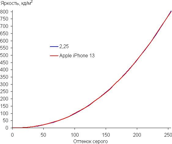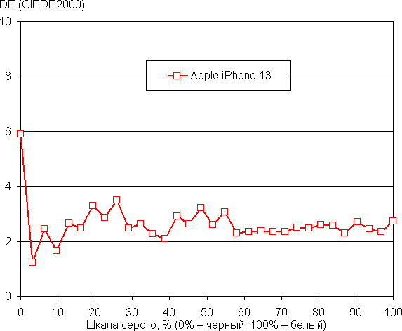 Видно, что в этом случае есть небольшое перекрестное подмешивание компонент в красной области, то есть родное для экрана Apple iPhone 13 цветовое пространство чуть шире, чем Display P3.