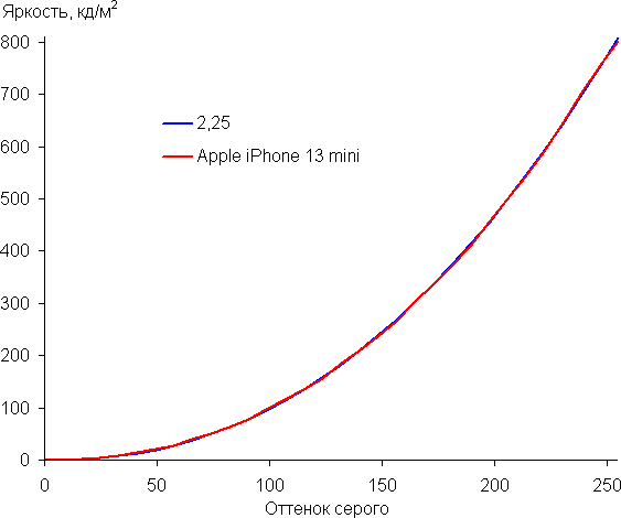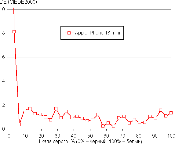 Видно, что в этом случае есть небольшое перекрестное подмешивание компонент в красной области, то есть родное для экрана Apple iPhone 13 mini цветовое пространство чуть шире, чем Display P3.