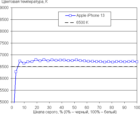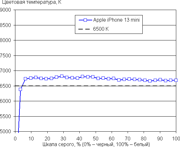 Баланс оттенков на шкале серого очень хороший, так как цветовая температура близка к стандартным 6500 К, а отклонение от спектра абсолютно черного тела (ΔE) меньше 10, что для потребительского устройства считается приемлемым показателем. При этом цветовая температура и ΔE мало изменяются от оттенка к оттенку — это положительно сказывается на визуальной оценке цветового баланса. (Самые темные области шкалы серого можно не учитывать, так как там баланс цветов не имеет большого значения, да и погрешность измерений цветовых характеристик на низкой яркости большая.)