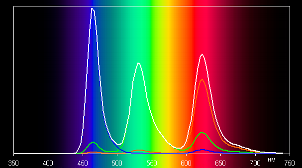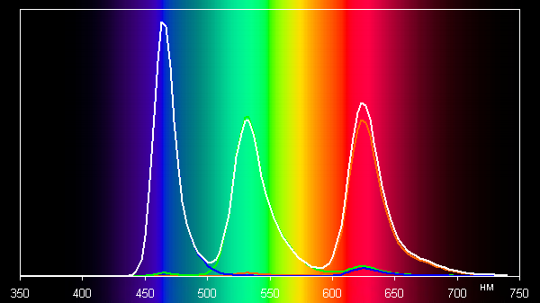 Такие спектры типичны для матриц OLED — компоненты хорошо разделены, что позволяет достигнуть широкого цветового охвата. Однако в данном случае цветовой охват аккуратно корректируется до границ sRGB. В итоге визуально цвета имеют естественную насыщенность.