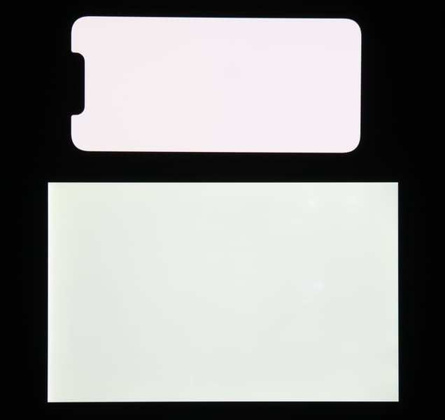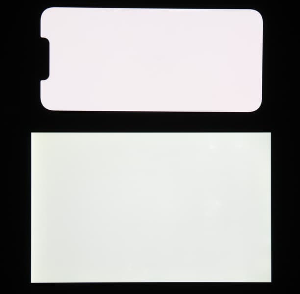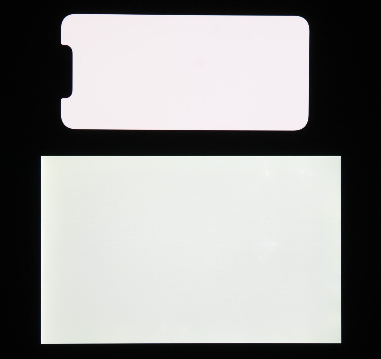 Экран характеризуется великолепными углами обзора. Правда, белый цвет при отклонении на большие углы приобретает легкий синеватый оттенок, но черный цвет остается просто черным под любыми углами. Он настолько черный, что параметр контрастности в данном случае неприменим. Для сравнения приведем фотографии, на которых на экраны Apple iPhone 13 и второго участника сравнения выведены одинаковые изображения, при этом яркость экранов изначально установлена примерно на 200 кд/м², а цветовой баланс на фотоаппарате принудительно переключен на 6500 К.