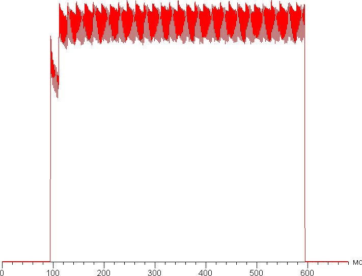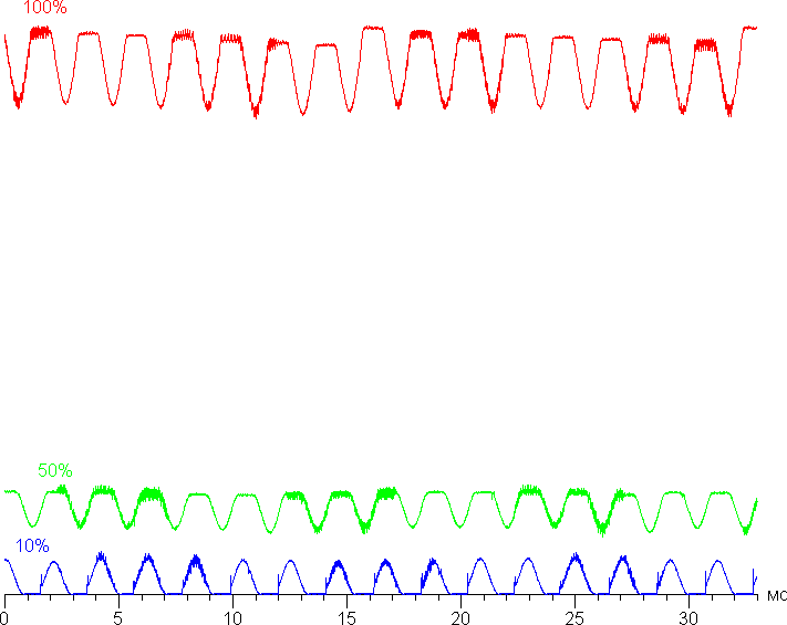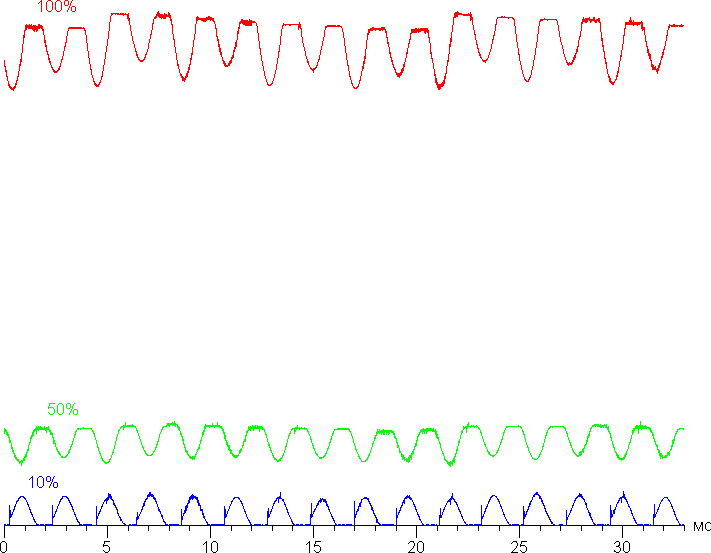 Видно, что на максимальной и средней яркости амплитуда модуляции не очень большая (точнее скважность явно низкая), в итоге видимого мерцания нет. Однако при сильном понижении яркости появляется модуляция с большой относительной амплитудой (и высокой скважностью), ее наличие уже можно увидеть в тесте на присутствие стробоскопического эффекта или просто при быстром движении глаз. В зависимости от индивидуальной чувствительности такое мерцание может вызывать повышенную утомляемость. Впрочем, частота довольно высокая и фаза модуляции различается по площади экрана, поэтому негативный эффект от мерцания снижен.