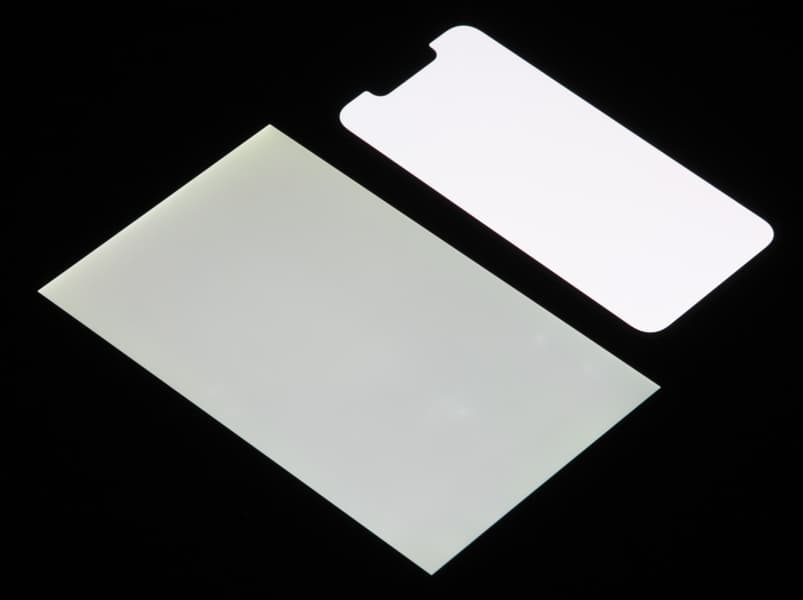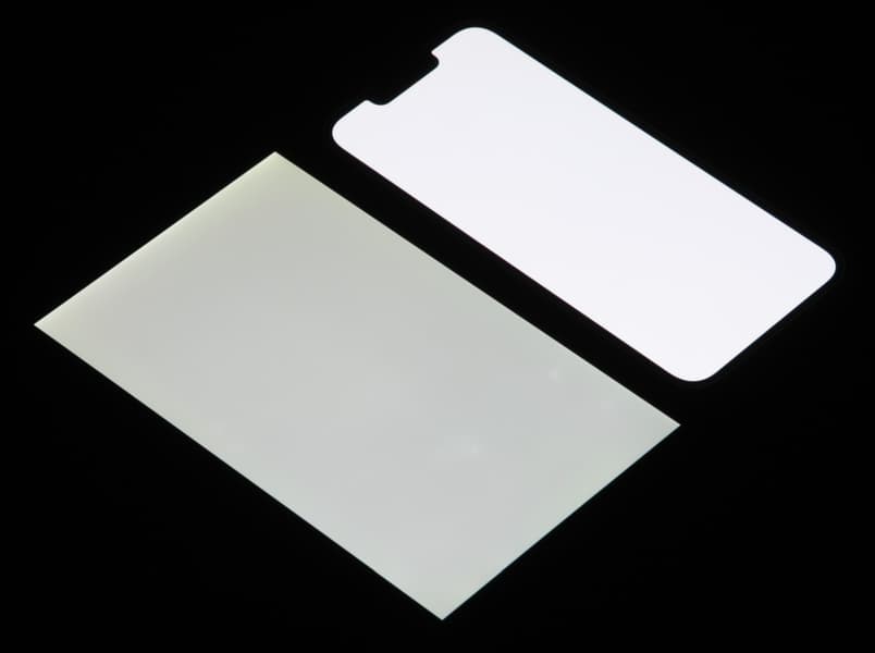 Лицевая поверхность экрана выполнена в виде стеклянной пластины с зеркально-гладкой поверхностью, устойчивой к появлению царапин. Судя по отражению объектов, антибликовые свойства экрана чуть лучше, чем у экрана Google Nexus 7 (2013) (далее просто Nexus 7). Для наглядности приведем фотографию, на которой в выключенных экранах отражается белая поверхность (слева — Nexus 7, справа — Apple iPhone 13, далее их можно различать по размеру):