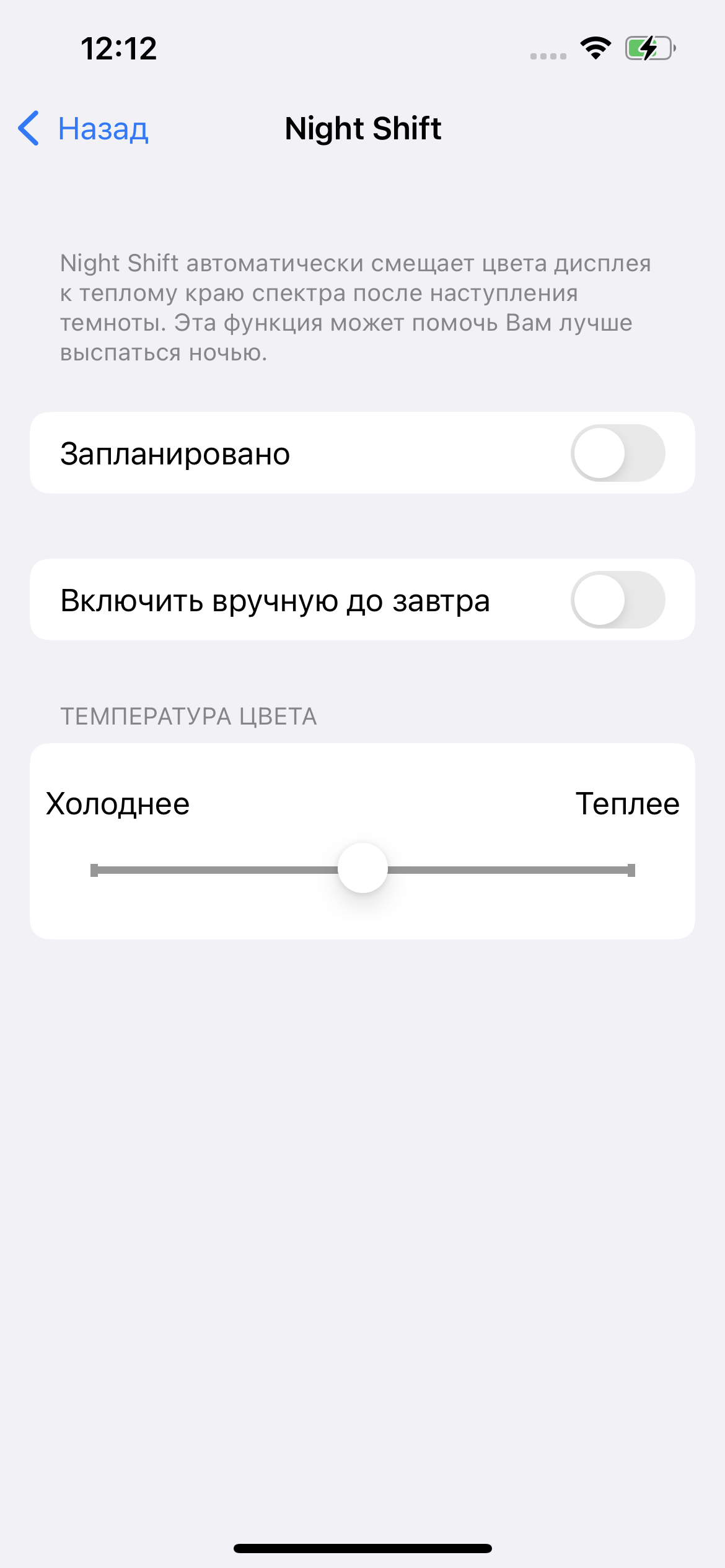 В этом устройстве Apple есть функция Night Shift, которая ночью делает картинку теплее (насколько теплее — указывает пользователь). В принципе, яркий свет может приводить к нарушению суточного (циркадного) ритма (см. статью про iPad Pro с дисплеем 9,7 дюйма), но все решается снижением яркости до низкого, но еще комфортного уровня, а искажать цветовой баланс, уменьшая вклад синего, нет абсолютно никакого смысла.