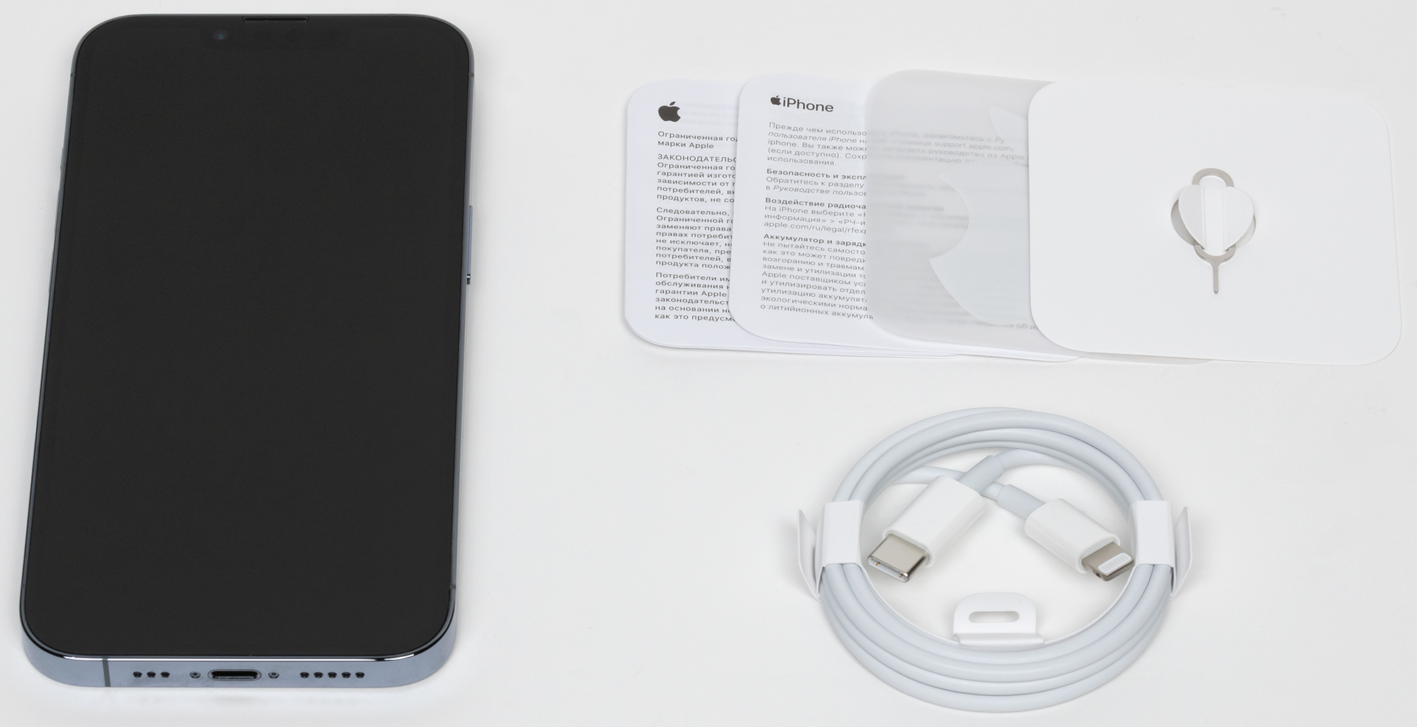 Внутри, как и раньше, кабель Lightning/USB-C, наклейка в виде логотипа Apple и ключик для извлечения SIM-карты.