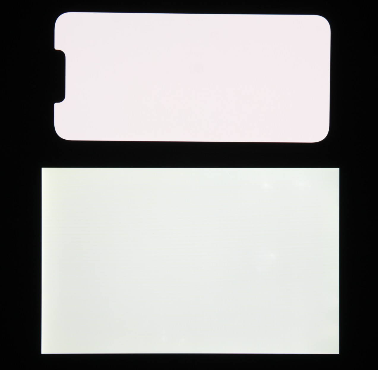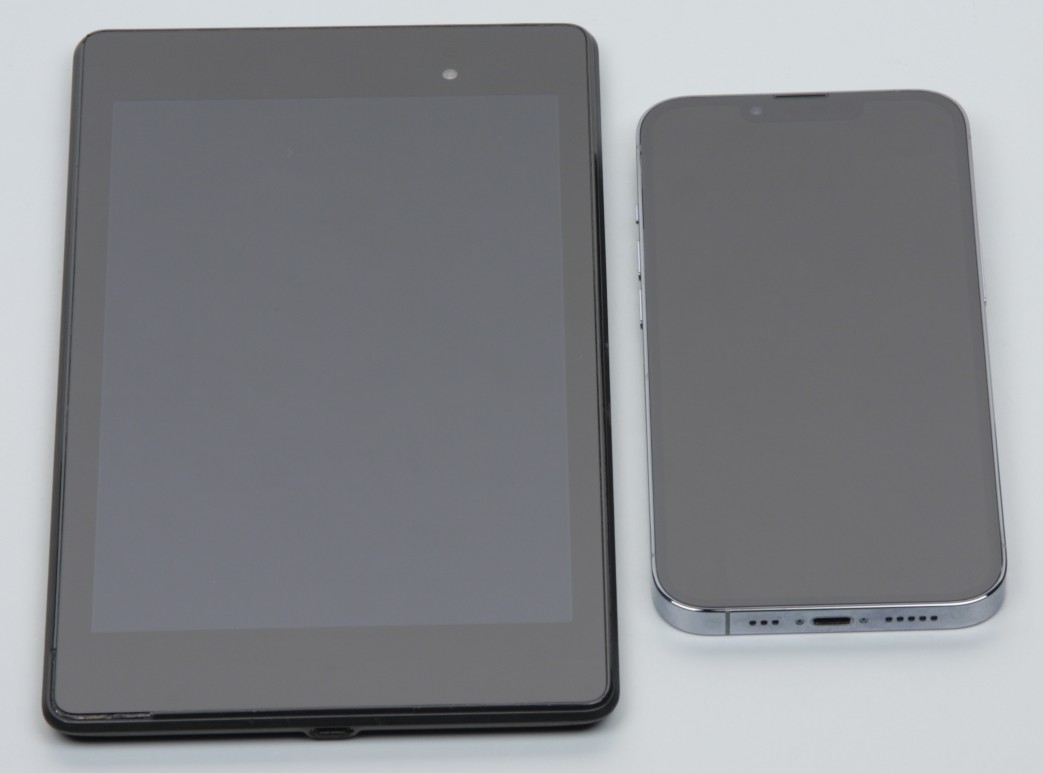 Лицевая поверхность экрана выполнена в виде стеклянной пластины с зеркально-гладкой поверхностью, устойчивой к появлению царапин. Судя по отражению объектов, антибликовые свойства экрана чуть лучше, чем у экрана Google Nexus 7 (2013) (далее просто Nexus 7). Для наглядности приведем фотографию, на которой в выключенных экранах отражается белая поверхность (слева — Nexus 7, справа — Apple iPhone 13 Pro, далее их можно различать по размеру):