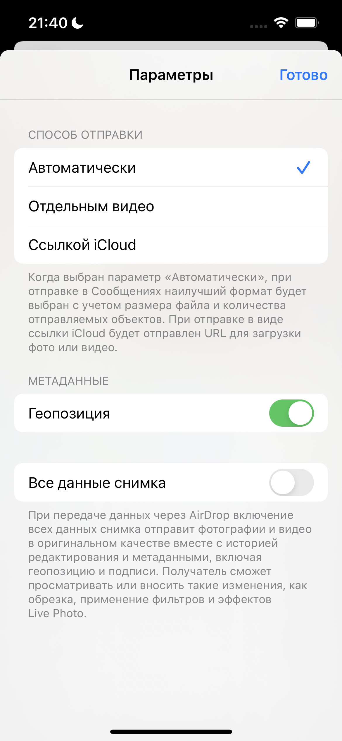 Но давайте еще посмотрим, как работать с видео, снятым с киноэффектом, в Final Cut Pro X — начиная с версии 10.6 он поддерживает эту функцию. На самом деле, его передача в FCPX — задача неординарная. Самое главное: при передаче видео с iPhone на Mac через AirDrop вам нужно выбрать вверху «Параметры» (маленькая, непримечательная строчка) и в открывшемся меню активировать рычажком пункт «Все данные снимка» (по умолчанию он выключен).