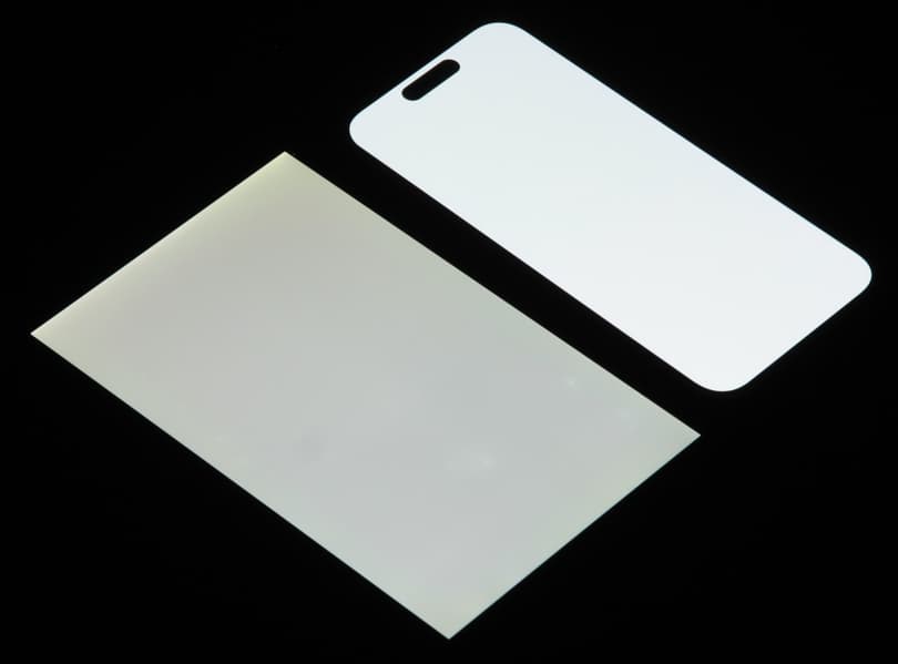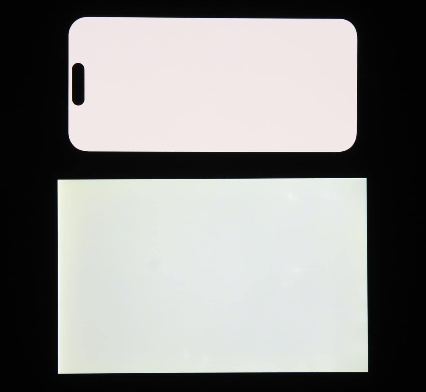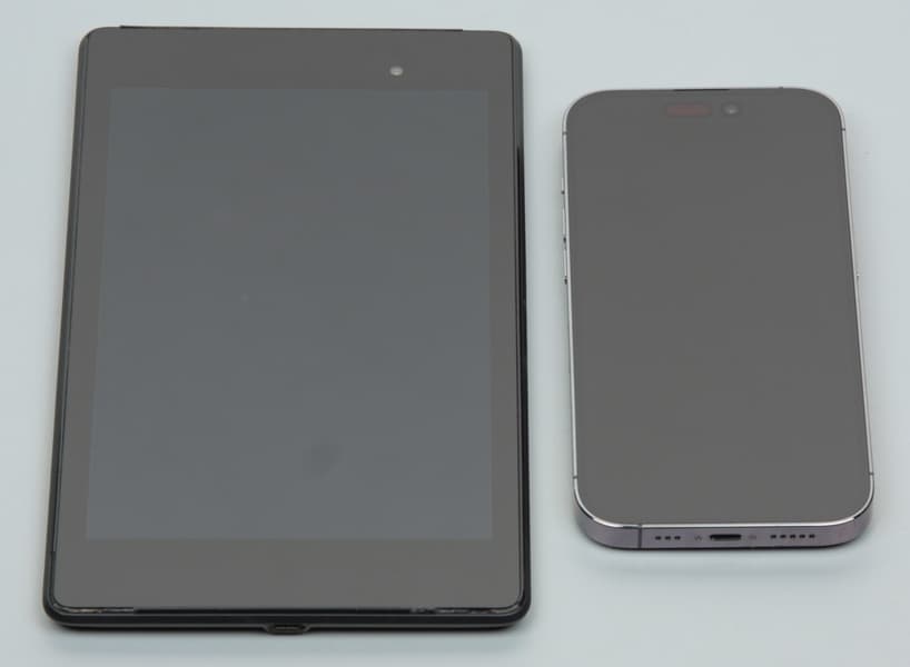 Лицевая поверхность экрана выполнена в виде стеклянной пластины с зеркально-гладкой поверхностью, устойчивой к появлению царапин. Судя по отражению объектов, антибликовые свойства экрана чуть лучше, чем у экрана Google Nexus 7 (2013) (далее просто Nexus 7). Для наглядности приведем фотографию, на которой в выключенных экранах отражается белая поверхность (слева — Nexus 7, справа — Apple iPhone 14 Pro, далее их можно различать по размеру):