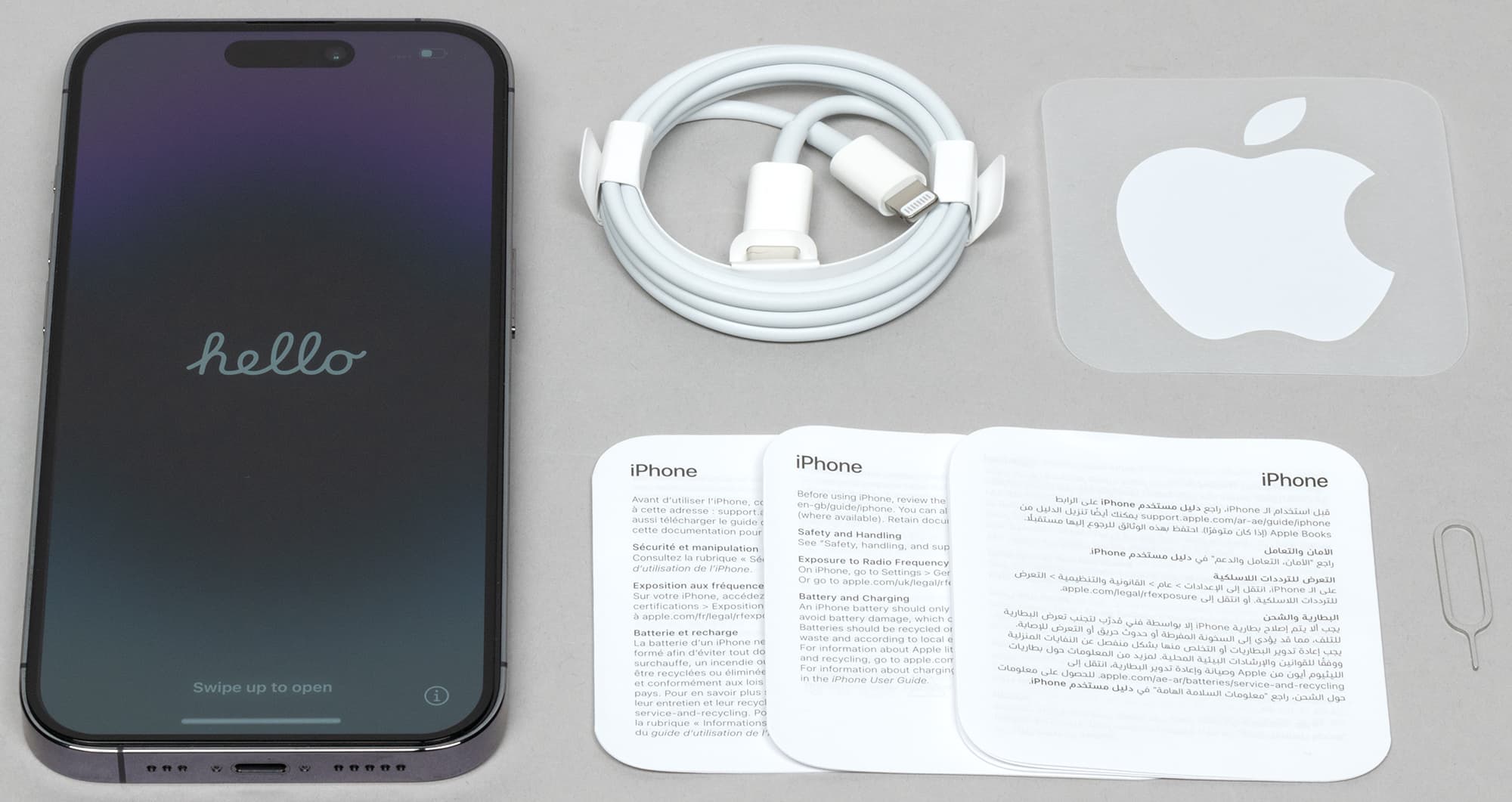Внутри, как и раньше, кабель Lightning/USB-C, наклейка в виде логотипа Apple и ключик для извлечения SIM-карты.