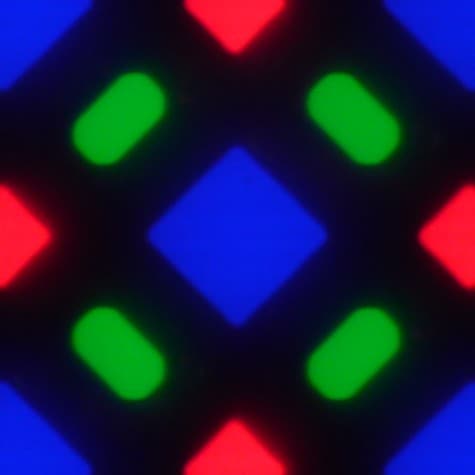 В этом экране используется матрица Super AMOLED — активная матрица на органических светодиодах. Полноцветное изображение создается с помощью субпикселей трех цветов — красного (R), зеленого (G) и синего (B), но красных и синих субпикселей в два раза меньше, что можно обозначить как RGBG. Это подтверждается фрагментом микрофотографии: