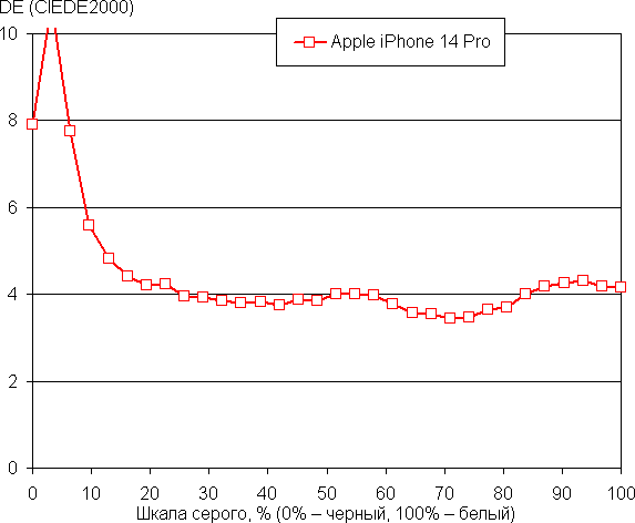 Видно, что в этом случае есть небольшое перекрестное подмешивание компонент, то есть родное для экрана Apple iPhone 14 Pro цветовое пространство чуть шире, чем Display P3.