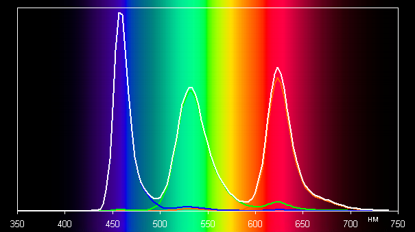 Такие спектры типичны для матриц OLED — компоненты хорошо разделены, что позволяет достигнуть широкого цветового охвата. Однако в данном случае цветовой охват аккуратно корректируется до границ sRGB. В итоге визуально цвета имеют естественную насыщенность.