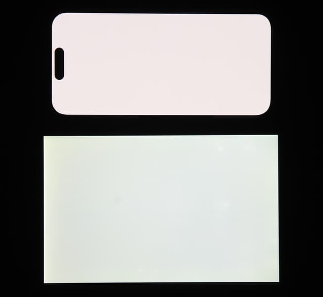 Экран характеризуется великолепными углами обзора. Правда, белый цвет при отклонении на большие углы приобретает легкий сине-зеленый оттенок, но черный цвет остается просто черным под любыми углами. Он настолько черный, что параметр контрастности в данном случае неприменим. Для сравнения приведем фотографии, на которых на экраны Apple iPhone 14 Pro и второго участника сравнения выведены одинаковые изображения, при этом яркость экранов изначально установлена примерно на 200 кд/м², а цветовой баланс на фотоаппарате принудительно переключен на 6500 К.