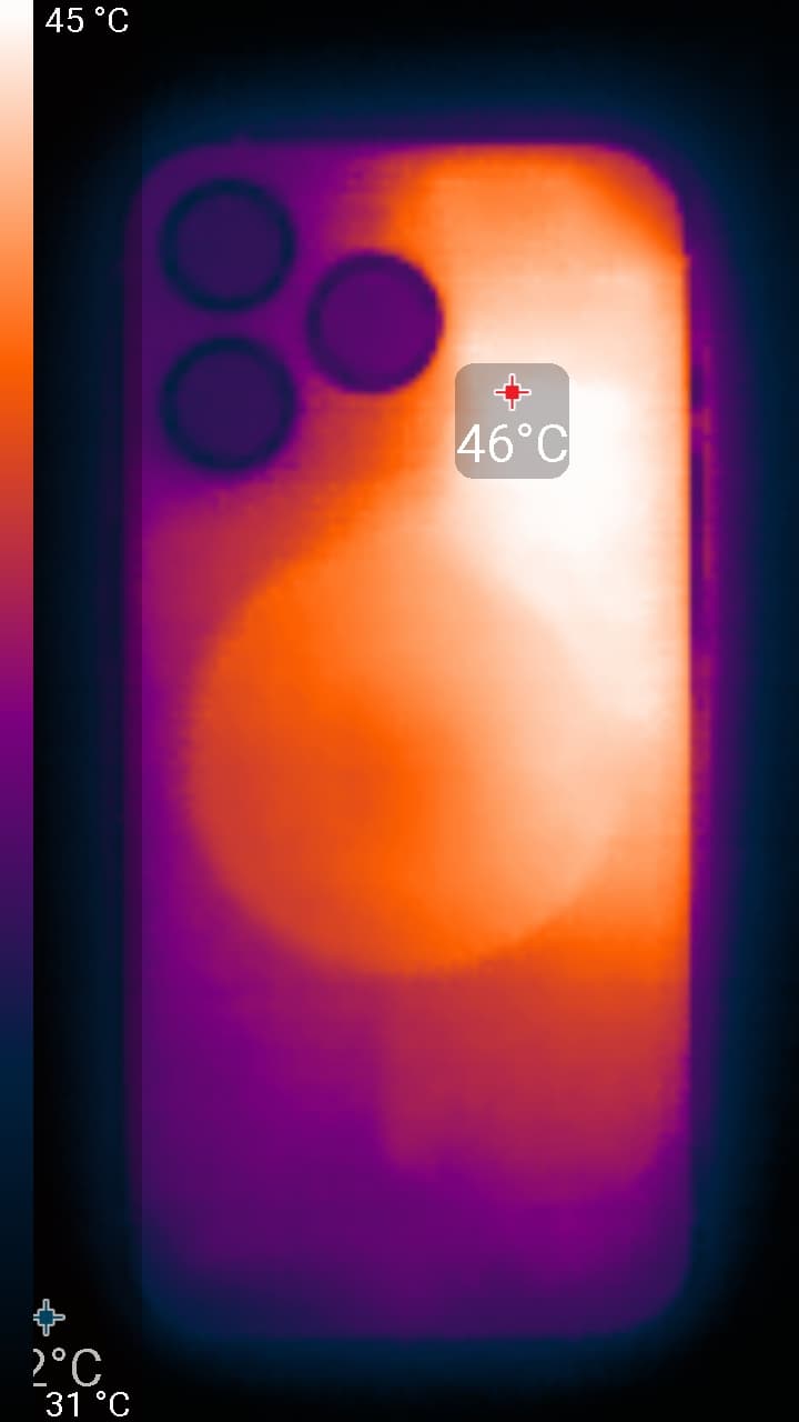 Нагрев больше в левой части аппарата, что, видимо, соответствует расположению микросхемы SoC. По данным теплокамеры, максимальный нагрев составил 46 градусов (при температуре окружающего воздуха в 24 градуса), это довольно много.
