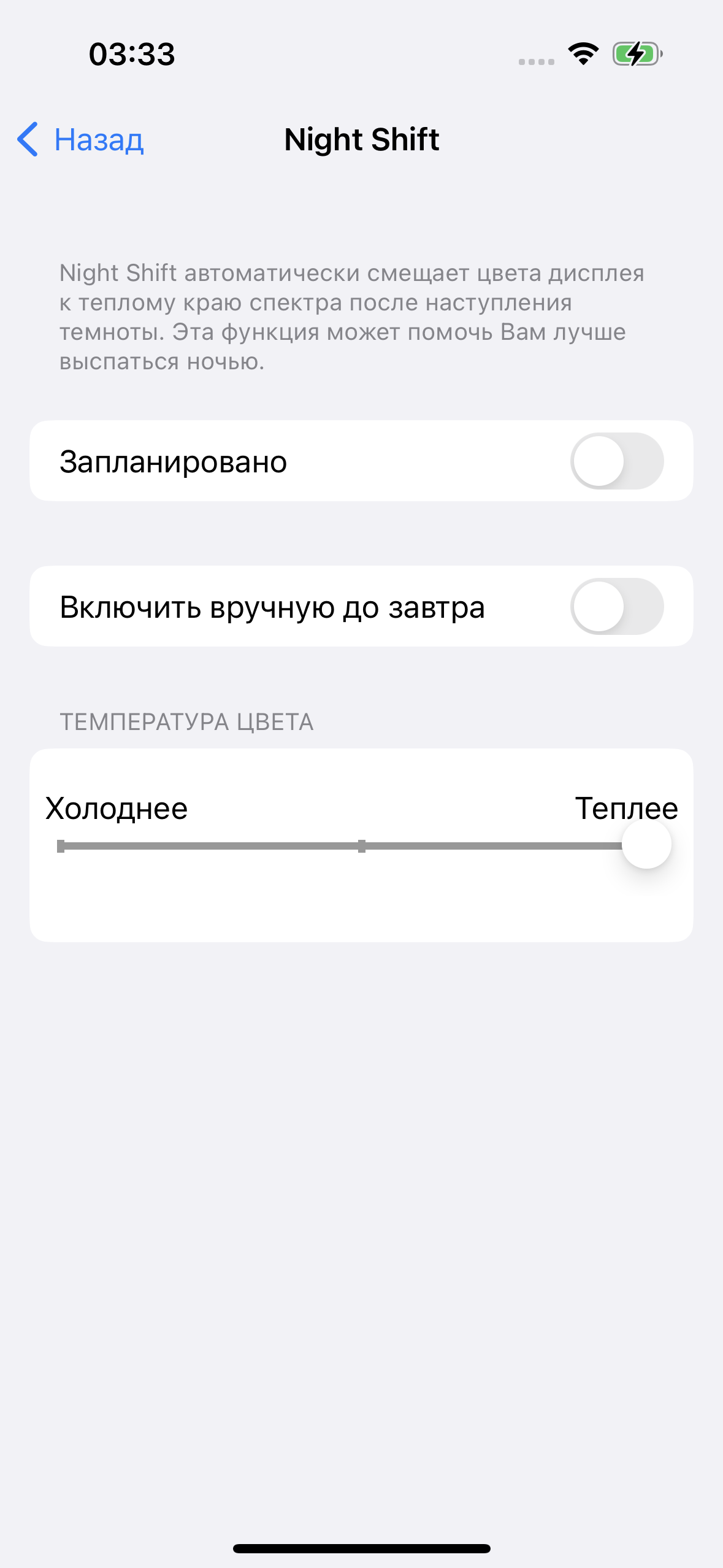 В этом устройстве Apple есть функция Night Shift, которая ночью делает картинку теплее (насколько теплее — указывает пользователь, в реальности от 6100 К до 2700 К). В принципе, яркий свет может приводить к нарушению суточного (циркадного) ритма (см. статью про iPad Pro с дисплеем 9,7 дюйма), но все решается снижением яркости до низкого, но еще комфортного уровня, а искажать цветовой баланс, уменьшая вклад синего, нет абсолютно никакого смысла.