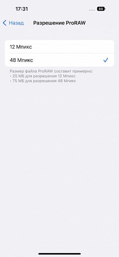 Во-первых, придется зайти в Настройки / Камера / Форматы и передвинуть рычажок напротив Apple ProRAW в активное положение, тем самым активировав возможность съемки в несжатом формате. Во-вторых, далее надо заглянуть в меню «Разрешение ProRAW» и поставить галочку напротив значения 48 Мп.