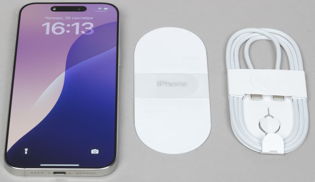 Внутри коробок — кабель USB-C—USB-C в тканевой оплетке, мини-листовки со всякой вспомогательной информацией и ключик для извлечения SIM-карты, который закреплен на картонке, удерживающей кабель. Кажется, впервые мы не видим наклейки в виде яблочка. Неужели от них было решено отказаться? Или это региональные особенности (официально в Россию новые айфоны, конечно, не поставляются)?