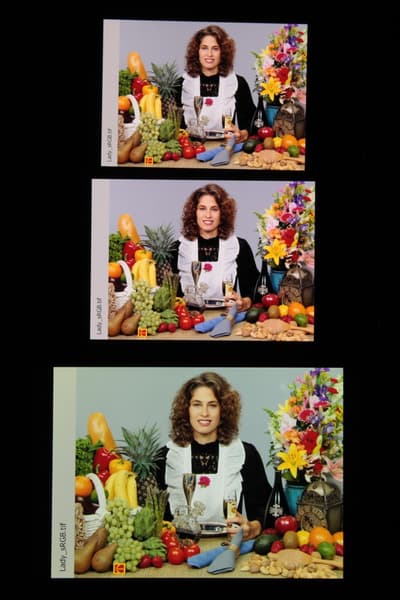 Это относится к тем изображениям, в которых прописан профиль sRGB или не прописано вообще никакого профиля. Однако родным для современных топовых устройств Apple является цветовое пространство Display P3 с немного более насыщенными зеленым и красным цветами. Пространство Display P3 основано на SMPTE DCI-P3, но имеет точку белого D65 и гамма-кривую с показателем примерно 2,2. Кроме того, производитель заявляет, что начиная с iOS 9.3 на системном уровне поддерживается управление цветом, это облегчает приложениям под iOS задачу правильно выводить на экран изображения с прописанным цветовым профилем. Действительно, дополнив тестовые изображения (файлы JPG и PNG) профилем Display P3, мы получили цветовой охват шире sRGB (вывод в Safari):