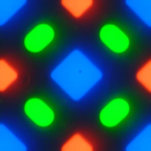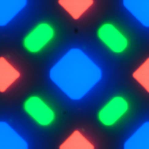 В этих экранах используется матрица Super AMOLED — активная матрица на органических светодиодах. Полноцветное изображение создается с помощью субпикселей трех цветов — красного (R), зеленого (G) и синего (B), но красных и синих субпикселей в два раза меньше, что можно обозначить как RGBG. Это подтверждается фрагментом микрофотографии: