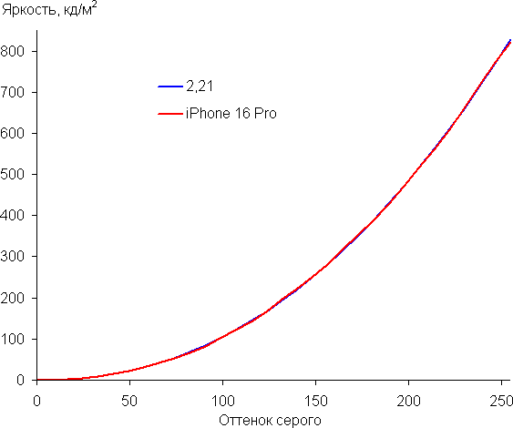 Построенная по 32 точкам с равным интервалом по численному значению оттенка серого гамма-кривая не выявила завала ни в светах, ни в тенях. Показатель аппроксимирующей степенной функции равен 2,21/2,19, что очень близко к стандартному значению 2,2. При этом реальная гамма-кривая мало отклоняется от степенной зависимости: