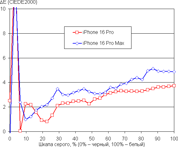 Баланс оттенков на шкале серого очень хороший, так как цветовая температура близка к стандартным 6500 К, а отклонение от спектра абсолютно черного тела (ΔE) ниже 10, что для потребительского устройства считается хорошим показателем. При этом цветовая температура и ΔE мало изменяются от оттенка к оттенку — это положительно сказывается на визуальной оценке цветового баланса. (Самые темные области шкалы серого можно не учитывать, так как там баланс цветов не имеет большого значения, да и погрешность измерений цветовых характеристик на низкой яркости большая.)