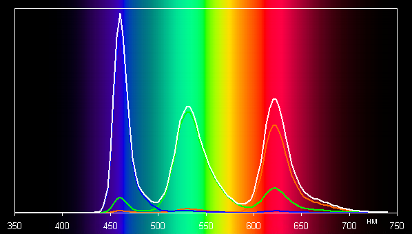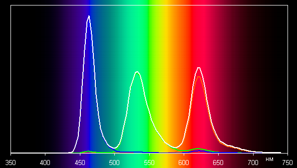 Такие спектры типичны для матриц OLED — компоненты хорошо разделены, что позволяет достигнуть широкого цветового охвата. Однако в данном случае цветовой охват аккуратно корректируется до границ sRGB. В итоге визуально цвета имеют естественную насыщенность.