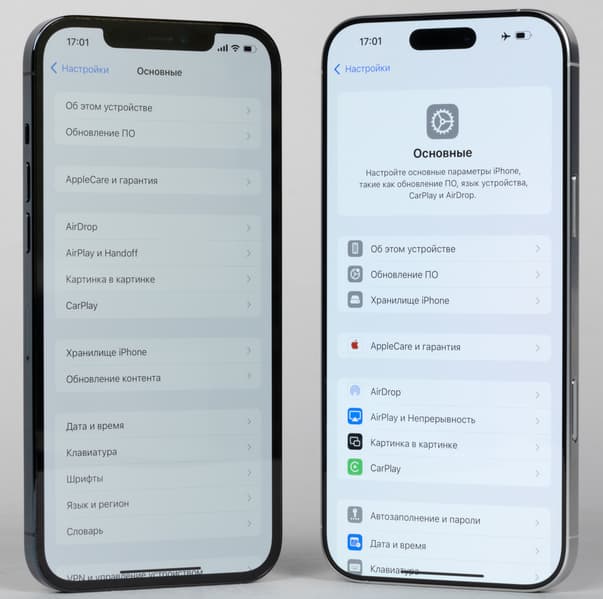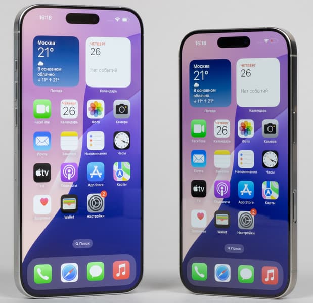- Сенсорный дисплей 6,3″, ProMotion XDR OLED, 2622×1206, 460 ppi, емкостной, мультитач, функция Always-On / 6,9″, ProMotion XDR OLED, 2868×1320, 460 ppi, емкостной, мультитач, функция Always-On
