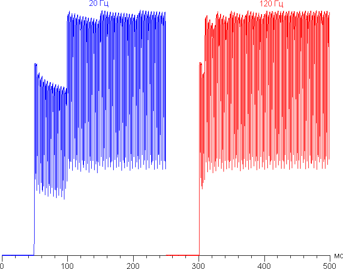 Переключение состояния элементов матрицы выполняется практически мгновенно, но на фронте включения может присутствовать ступенька шириной, определяемой текущей частотой обновления экрана. Например, в случае медленно меняющейся картинки частота обновления может существенно снижаться — мы регистрировали минимум в 10 Гц. В случае быстро меняющейся — повышаться до 120 Гц. Например, так выглядит зависимость яркости от времени при переходе от черного к белому при 20 Гц частоты обновления (ширина ступеньки примерно 50 мс) и при 120 Гц (ширина ступеньки примерно 8 мс):