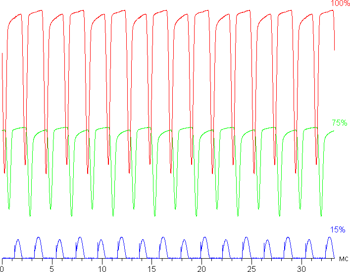 Видно, что на максимальной и средней яркости амплитуда модуляции не очень большая (точнее скважность явно низкая), в итоге видимого мерцания нет. Однако при сильном понижении яркости появляется модуляция с большой относительной амплитудой (и скважностью повыше), ее наличие уже можно увидеть в тесте на присутствие стробоскопического эффекта или просто при быстром движении глаз. В зависимости от индивидуальной чувствительности такое мерцание может вызывать повышенную утомляемость. Впрочем, частота довольно высокая и фаза модуляции различается по площади экрана, поэтому негативный эффект от мерцания снижен.