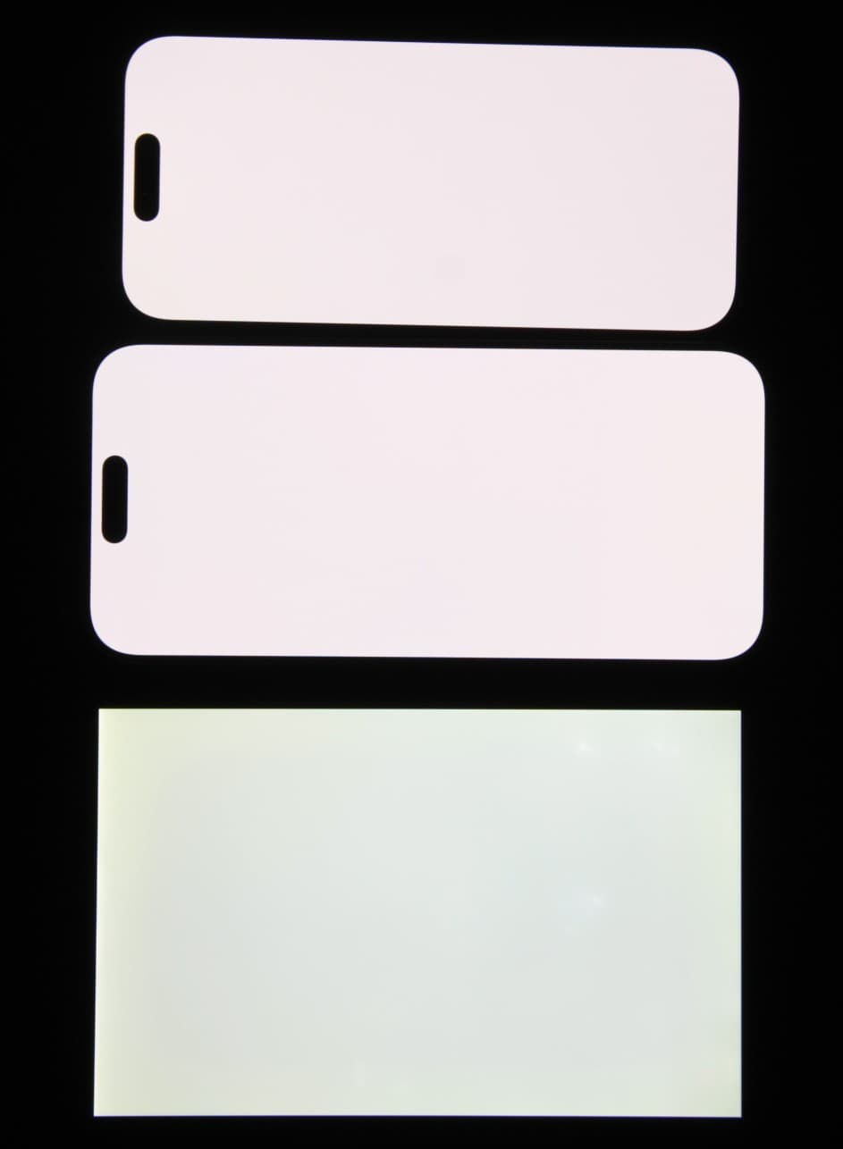 При ручном управлении яркостью и при выводе белого поля во весь экран максимальное долговременное значение яркости составило около 820/840 кд/м² (Pro/Pro Max), а на очень ярком свету в случае автоматической регулировки яркости оно повышается до 1025/1035 кд/м². В режиме HDR (то есть для HDR‑контента) максимальная яркость достигает порядка 1500 кд/м² даже для довольно больших по площади участков. Минимальное значение яркости — 1 кд/м². Максимальная яркость очень высокая, и, учитывая отличные антибликовые свойства, читаемость даже в солнечный день вне помещения будет на хорошем уровне. В полной темноте яркость можно понизить до комфортного значения. В наличии автоматическая регулировка яркости по датчику освещенности, которая включена по умолчанию. В автоматическом режиме при изменении внешних условий освещенности яркость как повышается, так и понижается. Работа этой функции зависит от положения ползунка регулировки яркости: им пользователь выставляет желаемый уровень яркости для текущих условий. Если ничего не менять, то в полной темноте яркость понижается до 2 кд/м² (темновато), в условиях освещенного искусственным светом офиса (около 550 лк) яркость экрана устанавливается на 100/110 кд/м² (приемлемо), в очень ярком окружении (освещенность более 20000 лк) поднимается до 1025/1035 кд/м² (до максимума, так и нужно). Результат нас не совсем устроил, поэтому в темноте мы чуть подвинули ползунок яркости вверх (в меню быстрого доступа), и для трех указанных выше условий получили 15, 90 и 1025/1035 кд/м² (идеально). Получается, что функция автоподстройки яркости работает адекватно, и есть возможность отрегулировать характер изменения яркости под требования пользователя.