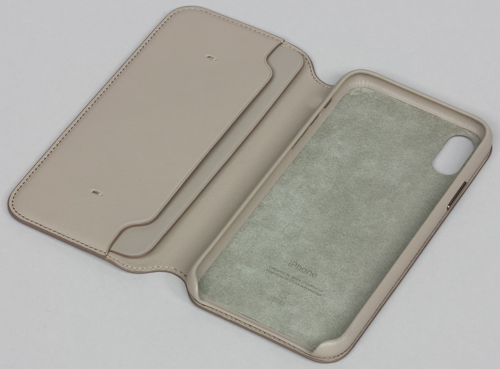 Он выполнен из мягкой натуральной кожи, очень приятной на ощупь, с прострочкой тонкой нитью. Внутри, где чехол соприкасается с корпусом, есть прокладка из микрофибры. Folio защищает смартфон со всех сторон, включая экран. Однако помимо функции защиты и разблокировки, у закрывающейся створки есть еще и функция кошелька с двумя отделениями: там можно хранить карточки (не больше 4-5), визитки, фотографии и т. п.
