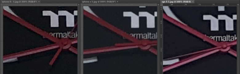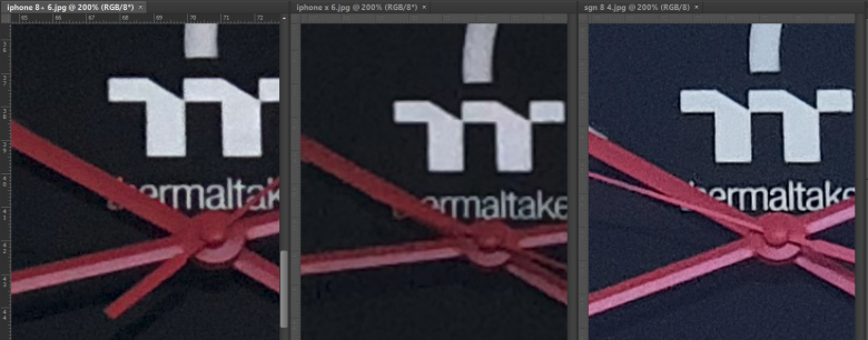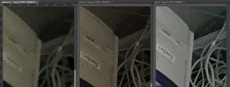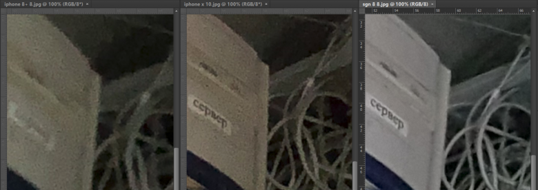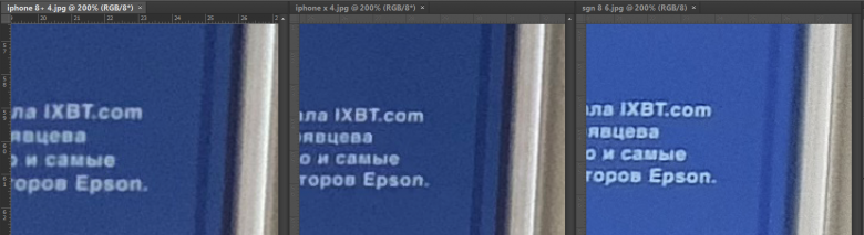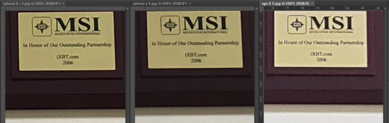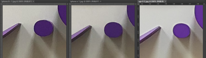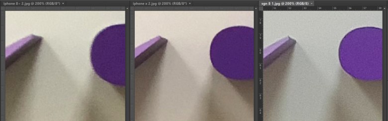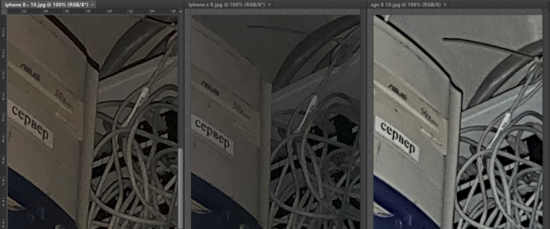 Ниже приведены фрагменты снимков с сильным увеличением. Слева направо располагаются iPhone 8 Plus, iPhone X и Galaxy Note 8.