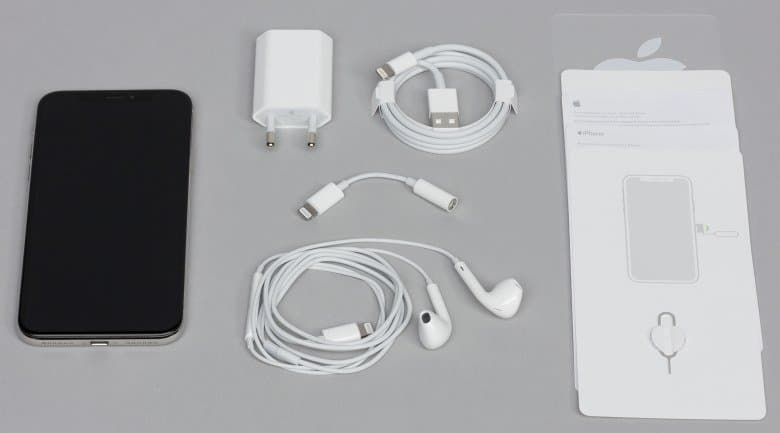 Комплектация ничем не отличается от iPhone предыдущих двух поколений: это блок питания 5 В 1 А, кабель Lightning, переходник с Lightning на миниджек (3,5 мм), наушники EarPods с разъемом Lightning и набор листовок.