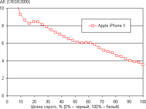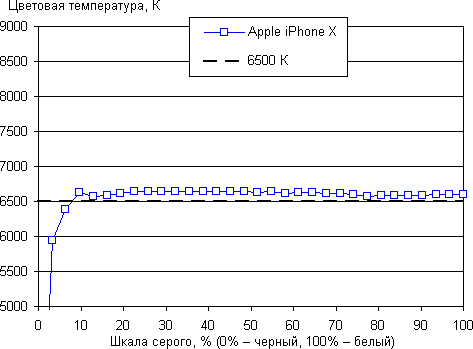 Баланс оттенков на шкале серого хороший, так как цветовая температура близка к стандартным 6500 К, а отклонение от спектра абсолютно черного тела (ΔE) меньше 10, что для потребительского устройства считается приемлемым показателем. При этом цветовая температура мало изменяется от оттенка к оттенку — это положительно сказывается на визуальной оценке цветового баланса. (Самые темные области шкалы серого можно не учитывать, так как там баланс цветов не имеет большого значения, да и погрешность измерений цветовых характеристик на низкой яркости большая.)