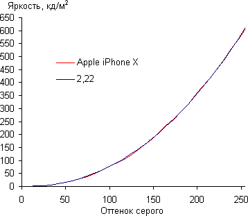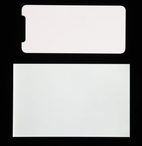 Экран характеризуется великолепными углами обзора. Правда, белый цвет при отклонении даже на небольшие углы приобретает легкий синеватый оттенок, но черный цвет остается просто черным под любыми углами. Он настолько черный, что параметр контрастности в данном случае неприменим. Для сравнения приведем фотографии, на которых на экраны Apple iPhone X и второго участника сравнения выведены одинаковые изображения, при этом яркость экранов изначально установлена примерно на 200 кд/м², а цветовой баланс на фотоаппарате принудительно переключен на 6500 К.