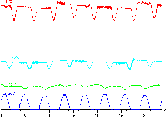 Видно, что на максимальной и близкой к ней яркости амплитуда модуляции не очень большая, в итоге видимого мерцания нет. Однако при сильном понижении яркости появляется модуляция с большой относительной амплитудой, ее наличие уже можно увидеть в тесте на присутствие стробоскопического эффекта или просто при быстром движении глаз. В зависимости от индивидуальной чувствительности такое мерцание может вызывать повышенную утомляемость.