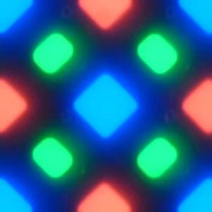 В этом экране используется матрица Super AMOLED — активная матрица на органических светодиодах. Полноцветное изображение создается с помощью субпикселей трех цветов — красного (R), зеленого (G) и синего (B), но зеленых субпикселей в два раза больше, что можно обозначить как RGBG. Это подтверждается фрагментом микрофотографии: