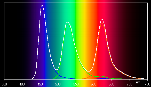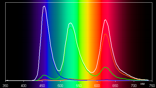 Такие спектры типичны для матриц OLED — компоненты хорошо разделены, что позволяет достигнуть широкого цветового охвата. Однако в данном случае цветовой охват аккуратно корректируется до границ sRGB. В итоге визуально цвета имеют естественную насыщенность.