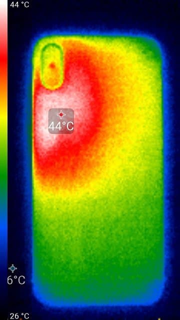 Нагрев сильно локализован в верхней правой части аппарата, что, видимо, соответствует расположению микросхемы SoC. По данным теплокамеры, максимальный нагрев составил 44 градуса (при температуре окружающего воздуха в 24 градуса). У Apple iPhone 7 Plus нагрев в этом тесте меньше.