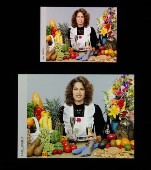 Это относится к тем изображениям, в которых прописан профиль sRGB или не прописано вообще никакого профиля. Однако родным для современных топовых устройств Apple является цветовое пространство Display P3 с немного более насыщенными зеленым и красным цветами. Пространство Display P3 основано на SMPTE DCI-P3, но имеет точку белого D65 и гамма-кривую с показателем примерно 2,2. Кроме того, производитель заявляет, что начиная с iOS 9.3 на системном уровне поддерживается управление цветом, это облегчает приложениям под iOS задачу правильно выводить на экран изображения с прописанным цветовым профилем. Действительно, дополнив тестовые изображения (файлы JPG и PNG) профилем Display P3, мы получили цветовой охват шире sRGB (вывод в Safari):