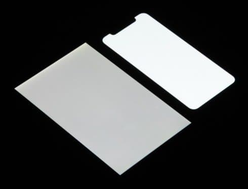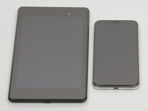 Лицевая поверхность экрана выполнена в виде стеклянной пластины с зеркально-гладкой поверхностью, устойчивой к появлению царапин. Судя по отражению объектов, антибликовые свойства экрана лучше, чем у экрана Google Nexus 7 (2013) (далее просто Nexus 7). Для наглядности приведем фотографию, на которой в выключенных экранах отражается белая поверхность (слева — Nexus 7, справа — Apple iPhone X, далее их можно различать по размеру):
