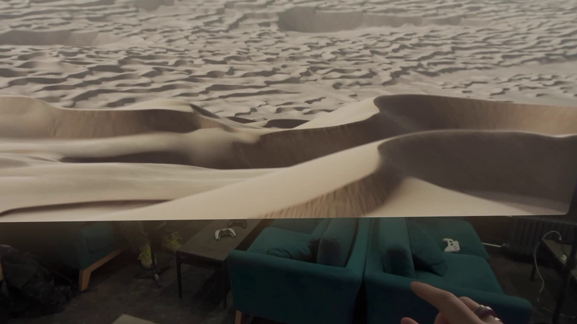 Самая важная часть Vision Pro — это собственно передняя часть, со стеклами. Здесь расположены датчики, дисплеи с разрешением 4К на каждый глаз, а также камеры, которые фиксируют окружающую реальность и транслируют ее внутрь Vision Pro. На скриншоте ниже видно, как виртуальные меню соседствуют с объектами настоящего мира.