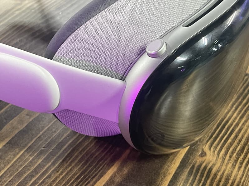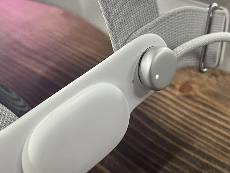Справа вверху, если надеть гарнитуру, расположено колесико Digital Crown, почти в точности такое же, как у наушников AirPods Max. Нажатие на него позволяет вернуться на главный экран, а вращая его, мы меняем степень прозрачности объектов окружающего (реального) мира. Это интересное ощущение: вот ты чуть-чуть поворачиваешь колесико — и уже видишь фигуры людей. Однако даже если ты полностью в виртуальной реальности, а к тебе подойдет человек или начнет говорить, то он всё равно станет видим. Но к вопросу управления мы еще вернемся.