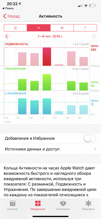 Аналогично с окончанием тренировки. Если вы забыли отключить тренировку на часах, Apple Watch через какое-то время предложит вам это сделать и, в случае вашего согласия, будет считать концом тренировки момент, когда было зафиксировано изменение поведения пользователя. На скриншоте выше время тренировок (48 минут) было зафиксировано именно таким образом: автор статьи двигался быстрым шагом, часы минут через 5-10 понимали, что это ходьба, и предлагали зафиксировать тренировку. Кроме того, в watchOS 5 появились новые виды тренировок: йога и пеший туризм, а возможности бега существенно расширились (появился целевой темп и отслеживание каденса).