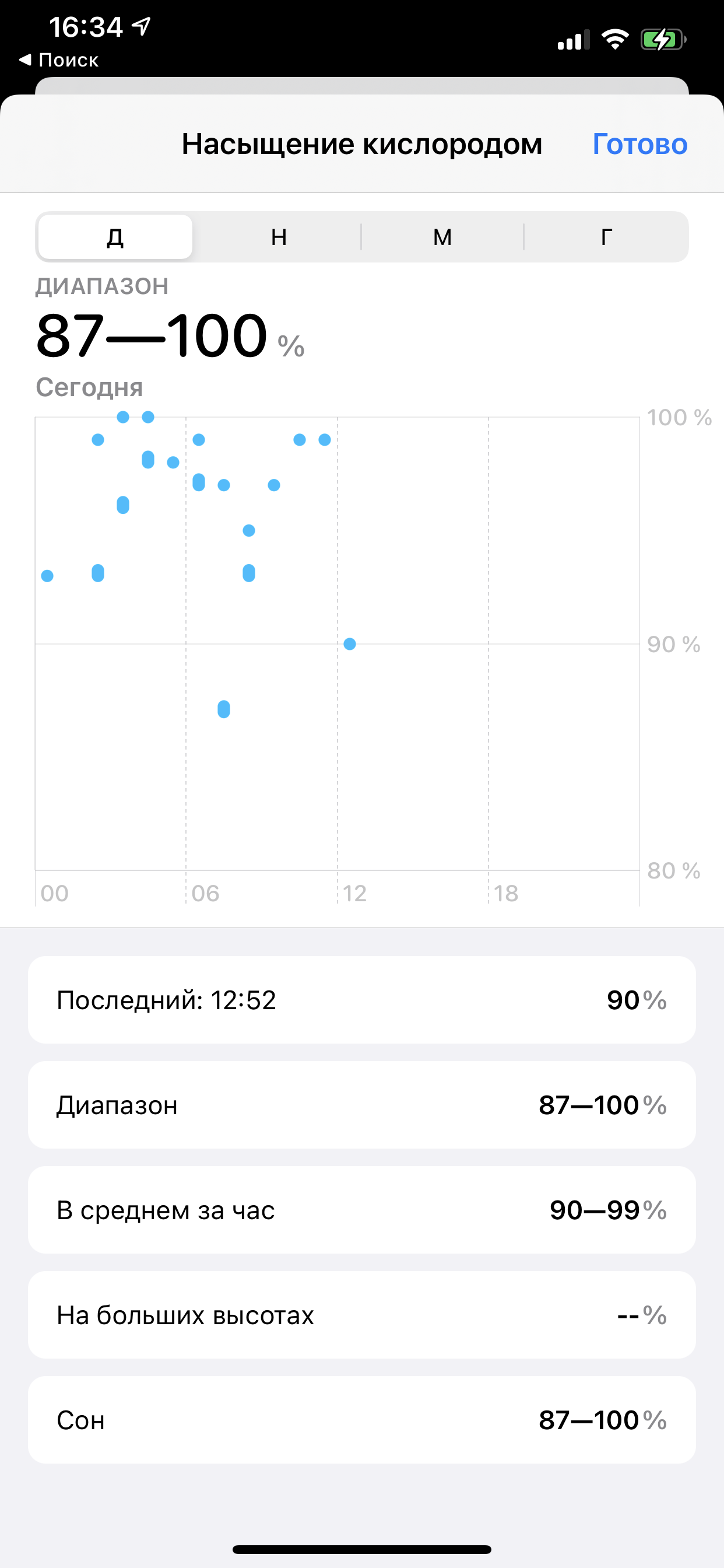 Какие можно сделать выводы? Во-первых, измерения производятся примерно каждый час. Но бывают пропущенные часы — видимо, это те периоды, когда пользователь, например, едет в транспорте или гуляет и часы не могут поймать момент полного спокойствия. Во-вторых, немного удивляет разброс результатов. Например, по скриншотам выше видно, что неоднократно часы определяли количество кислорода меньше 90%. Строго говоря, если бы оно так было на самом деле, автор бы лежал с аппаратом искусственного дыхания, а не писал эту статью (трижды плюем через плечо и стучим по дереву). При этом ряд измерений показывает, что у автора 100% кислорода в крови. Что, мягко говоря, тоже невозможно. И все это в течение одного и того же дня. На самом деле, диапазон для здорового человека — 95%—98%.