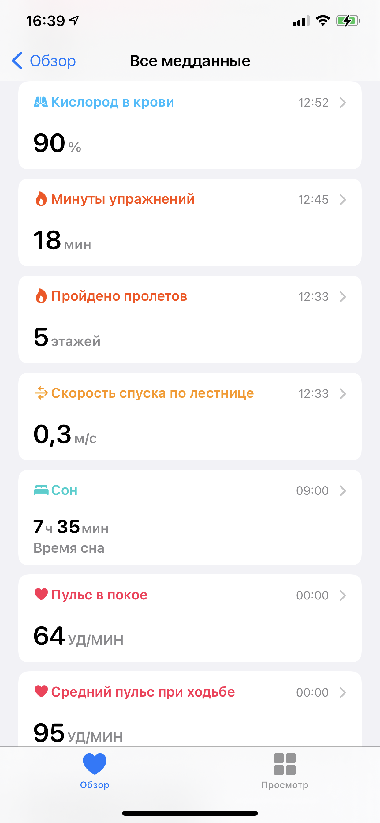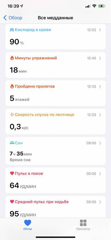 Оговоримся, что результаты эти спрятаны весьма хитрым образом в приложении «Здоровье». С главного экрана приложения («Обзор») надо нажать на пункт меню «Показать все медданные», дальше пролистать три экрана вниз — только после этого мы увидим строчку «Кислород в крови».