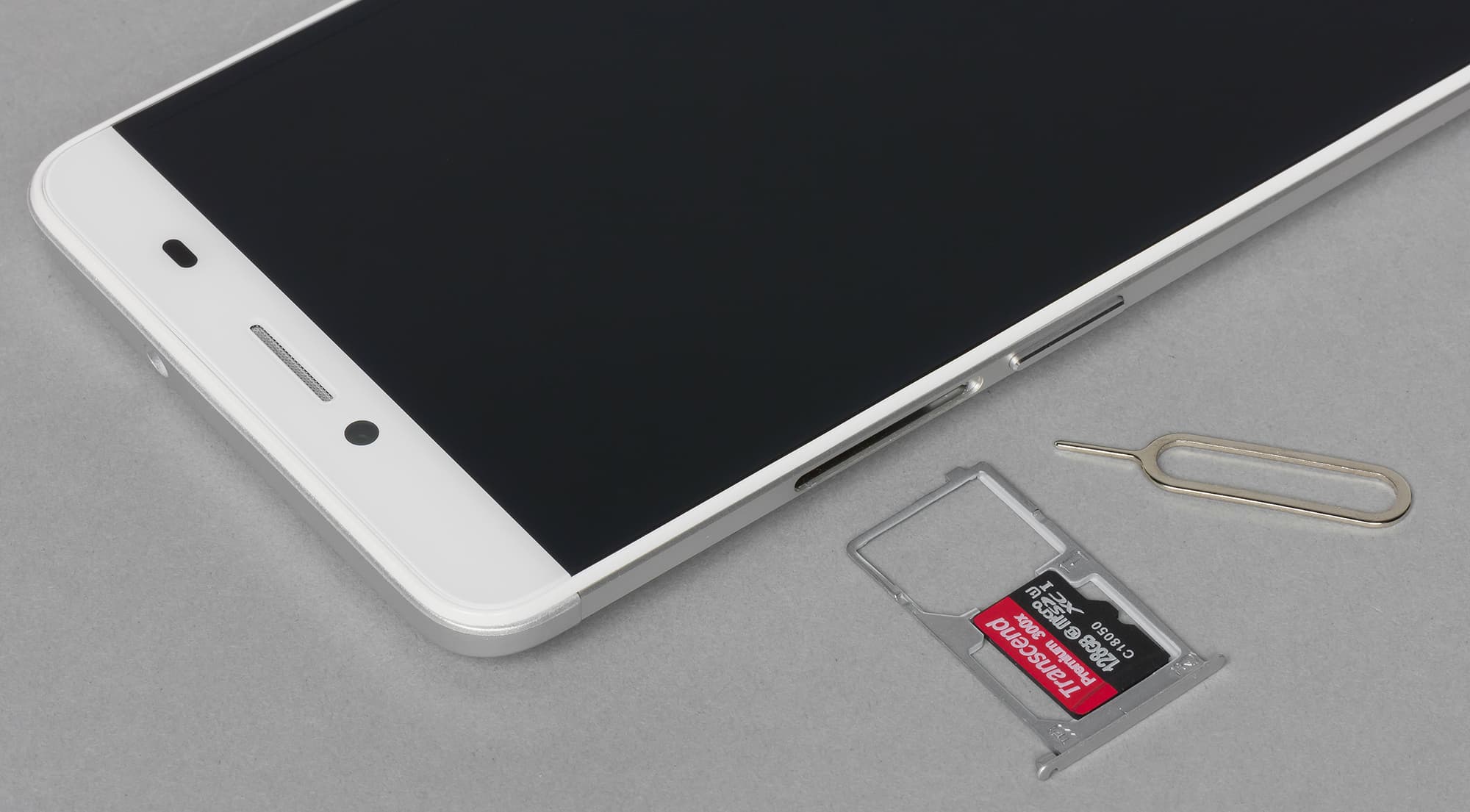 Поскольку съемной крышки здесь нет, аппарат получил соответствующий вариант установки карточек: металлический лоток вставляется в боковой слот и вынимается с помощью комплектного ключика-скрепки. Салазки имеют две ячейки, в которые можно уложить две карточки формата Micro-SIM либо карту памяти вместо одной из них. Официально поддерживаются карты microSD объемом до 32 ГБ, но наша проверочная карта Transcend Premium microSDXC UHS-1 объемом 128 ГБ уверенно распозналась устройством. Поддерживается горячая замена SIM-карт, а при установке карты памяти аппарат перезагружается самостоятельно.