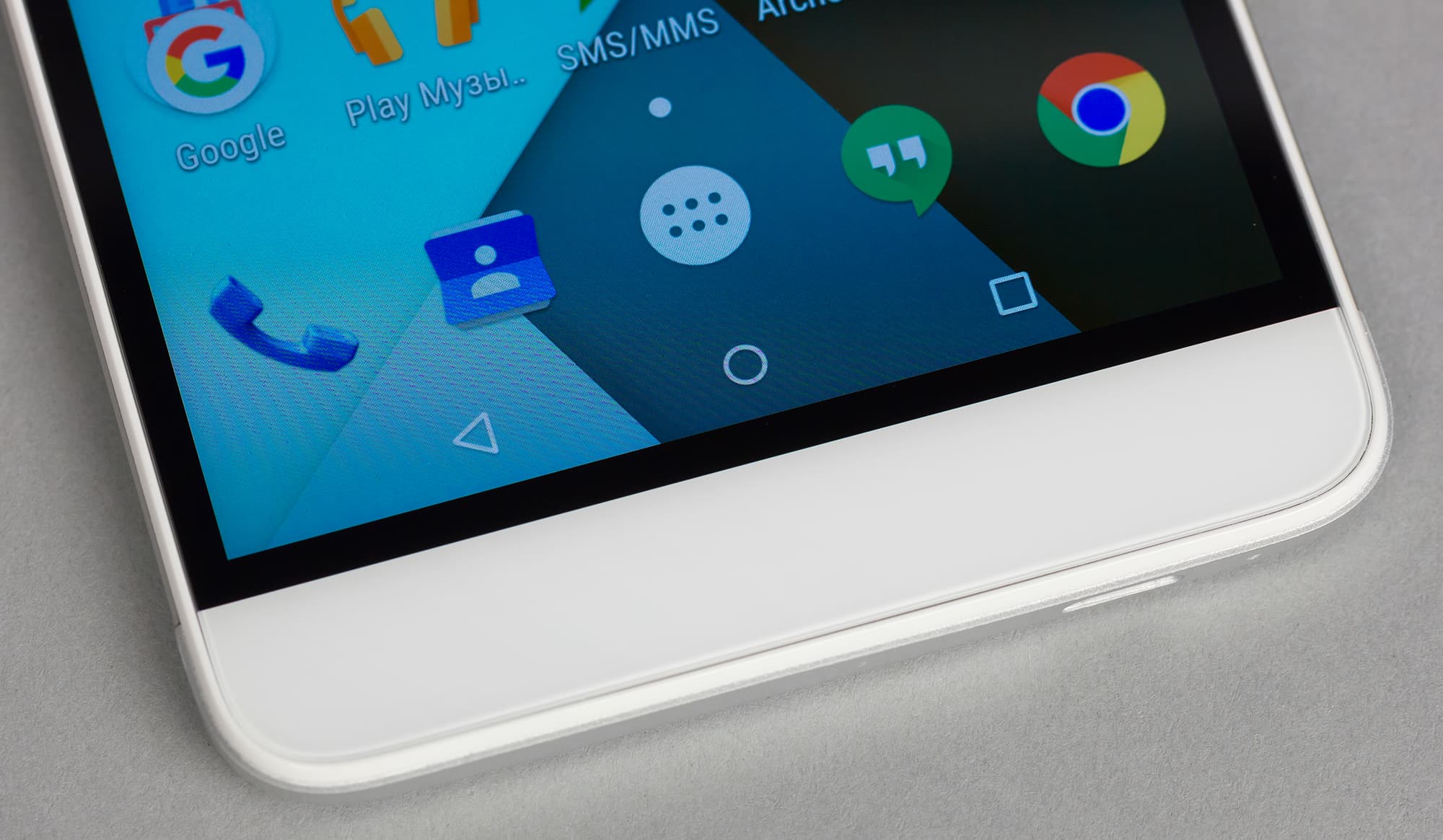 Передняя панель полностью прикрыта плоским защитным стеклом без бортиков. В верхней части расположены сенсоры, модуль фронтальной камеры и светодиодный индикатор событий. В нижней части сенсорных кнопок нет.