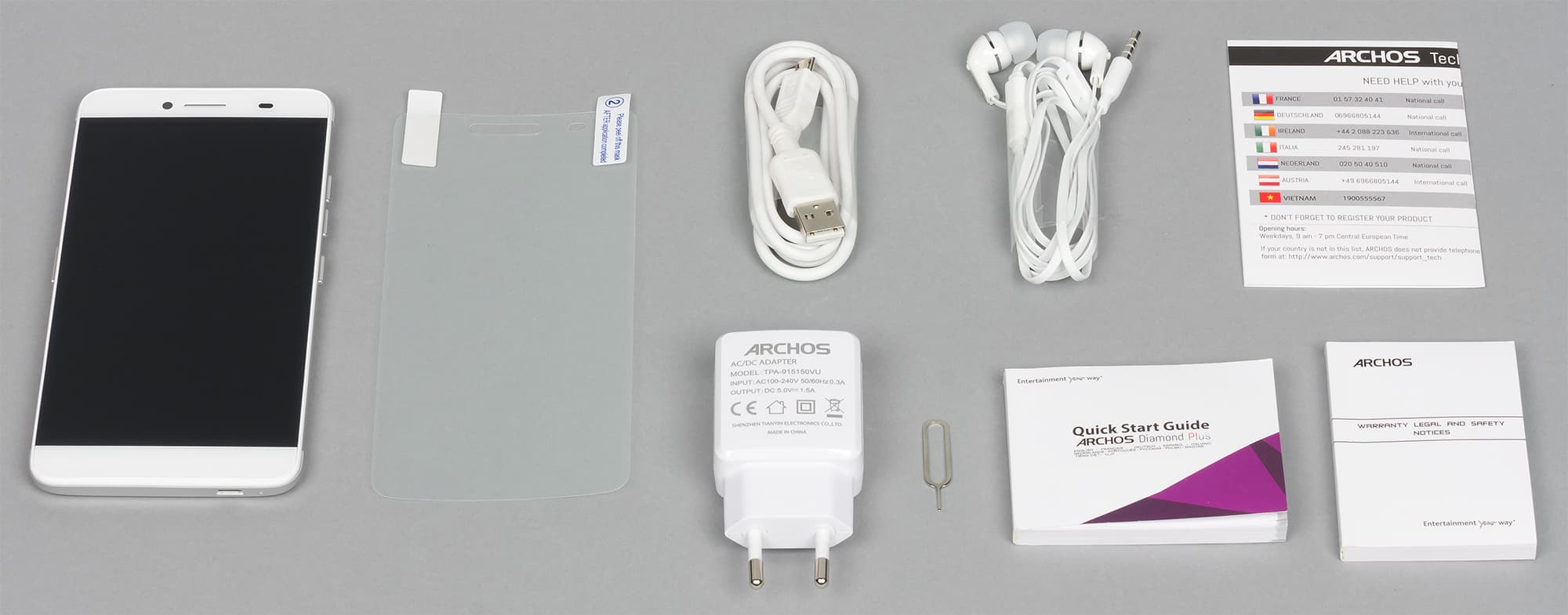 Комплект аксессуаров состоит из зарядного устройства с выходным током 5 В 1,5 А, соединительного кабеля Micro-USB, проводной стереогарнитуры с резиновыми амбушюрами внутриканального типа, а также защитной пленки на экран, ключика и пары пухлых бумажных книжиц с информацией.